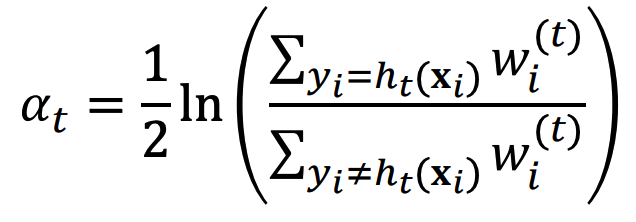 (4) $2\alpha_{t} = log(\frac{\sum_{y_{i} = h_{t}(x_{i})} w_{i}^{(t)}}{\sum_{y_{i}\neq h_{t}(x_{i})} w_{i}^{(t)}})$ 에서 2를 나눠주면 아래의 수식으로 정리가 끝난다.