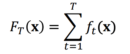 앞선 부스팅 알고리즘의 방식을 그대로 기용하고 있다. 순차적으로 weak learner 를 학습하고 weighted manner 로 합쳐서 최종 예측을 하게 된다. 최종 모델을 수식으로 표현하면 아래와 같다. T 가 의미하는 것은 T 개의 weak learner를 합쳤다고 생각하면 된다. 그리고 소문자 t 는 각 step 을 나타낸다. 각 스텝에서 input $x$를 가지고 만든 개별모델 $f_{t}(x)$ 를 모두 결합하여 최종적인 모델 $F_{T}(x)$를 얻게 된다. $f_{t}(x)$는 안에 weight 까지 포함되어 있다는 것을 상기하자.