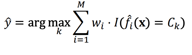 만약 클래스에 대한 확률값으로 output 이 나오는 것이 아니라 output이 딱 클래스 하나를 뱉는 그런 모델인 경우에는 아래의 방법을 사용한다. 먼저 $I$는 indicator function으로 사용되며 input 값이 참이면 1 아니면 0을 뱉는 성질을 가지고 있다. $i$번째에 추정된 모델의 예측값이 참이면 1 아니면 0을 나타낸다. 그래서 예측값은 각 클래스별로 예측하는 것들에 대해 weight를 각각 더해서 weight 가 가장 큰 클래스 k 로 예측을 하겠다는 것이다.