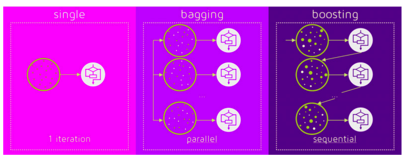 아래의 그림을 보자. 배깅 같은 경우에는 원래의 데이터 셋에서 여러개의 서브셋을 만들고 개별모델을 만드는 것을 볼 수 있다. 즉 병력적으로 만든다고 볼 수 있다. 부스팅 경우에는 서브셋을 업그레이드 시켜나가는 것이 보이며, 순차적으로 진행하니 병렬처리가 불가능하다.