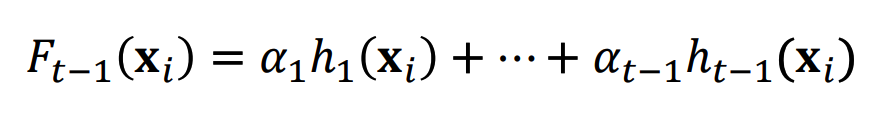 아래의 수식을 보자. $F_{t-1}(x_{i})$ 는 이전까지의 weak learner들을 합쳐놓은 것이라 정의를 한다.