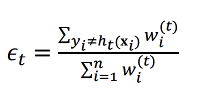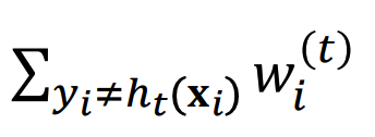 그런 다음에 아래의 입실론을 전체 weight 들에 대해서 예측 실패한 것들의 weight들의 비중으로 정의한다.