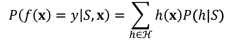 새로운 데이터 샘플 $x$ 가 주어지고 학습 샘플 $S$가 주어질 때, 예측값 $f(x)$ 는 $P(f(x) = y|S,x)$ 를 계산하는 문제로 볼 수 있다. 이는 모든 가설 ℋ 에 대한 weighted sum 이라 할 수 있다.