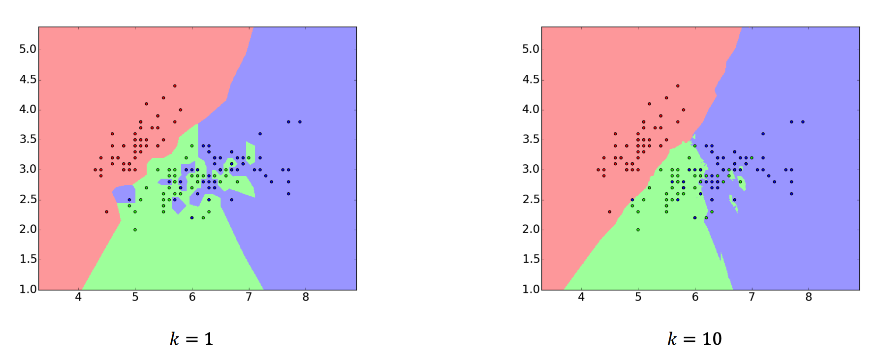 아래의 경우는 knn 에서 k가 각각 1일 때, 10일 때를 나타낸다. 왼쪽그림 같은 경우는 근접이웃 1명의 정보만을 가지고 예측을 하기에 bias는 낮지만 분산이 엄청커지니까 overfitting 된다는 것을 확인할 수 있다. 또 boundary 관점에서 보면, k 가 1인 경우에는 샘플이 약간만 변해도 boundary가 많이 변할 것이고, k가 10인 경우를 보면 클러스터 내의 샘플이 조금 변해도 boundary가 크게 변하지 않는다는 것을 알 수 있다.