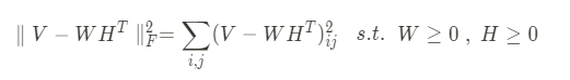 목적함수는 아래와 같이 설정이 되고, 초기의 행렬의 원소값인 실젯값과 W, H의 dot product로 이뤄진 행렬의 원소와의 차이의 제곱의 합 즉, SSE를 최소화 하는 방식으로 진행이 된다.