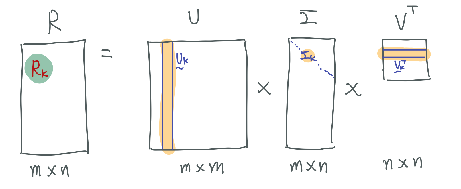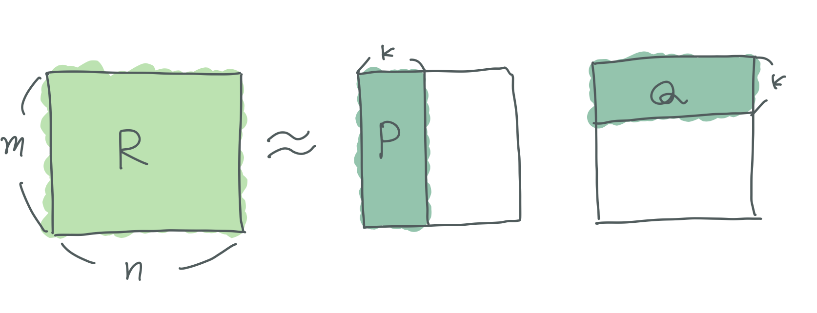 k 를 정했다면 user의 개수 m, item의 개수 n을 오른쪽 진한 녹색 부분인 '임의의 행렬'로 구성해주고, 이 두 녹색의 곱을 가지고 예측 값을 생성하고, 원래 R 행렬의 실제 평점들과의 비교를 통해 녹색이 가진 원소들의 값들을 업데이트 시켜준다. SVD 와 동일하게 초기 R 행렬의 null 값에 대해서 0으로 채워주지만(무조건 0으로 채우지는 않는다, 평균과 같은 값을 넣어주기도 한다.)