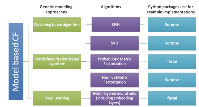 아래의 그림은 model based CF 알고리즘에 대한 방법론들을 도식화 해놓은 그림이다. model based CF 방법들은 크게 클러스터링을 기반으로하는 알고리즘, 행렬 분해를 사용한 알고리즘, 그리고 성능이 가장 뛰어난 딥러닝 알고리즘으로 나뉘게 된다. 여기서 Matrix factorization 을 기반으로한 추천시스템의 알고리즘에 대해 알아보도록 한다.