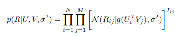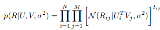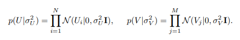 주어진 데이터 셋에서 원소들의 집합 R이 등장할 확률은 아래와 같은 수식으로 구성된다. 사용자와 아이템의 latent vector 의 곱한 값을 평균으로 사용하며, $\sigma^{2}$을 분산으로 한 정규분포들의 곱으로 구성된다. 위의 그림과 아래의 두번째 수식처럼 U, V 역시 가우시안 분포를 따르는 matrix 를 가정한다. 각각 평균과 분산으로 zero-mean, $\sigma$로 구성된다.