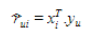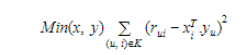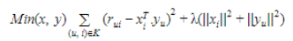 아래의 수식에서 $\hat{r}_{ui}$ 는 SVD를 통해 생성된 factorization 의 형태로 표현이 되고, 이는 $x$와 $y$ 간의 곱으로 형성이 되게 된다.