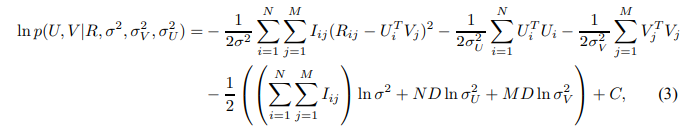 위의 정의한 식을 Bayesian rule을 활용하여 전개하고(생략), MAP(Maximum a Posterior) Estimation을 활용해 아래와 같은 식을 구성한다. 사용자, 아이템 feature로 얻어지는 posterior 분포의 로그 값이 아래와 같이 주어질 때, $C$는 parameter에 의존하지 않는 constant이다.