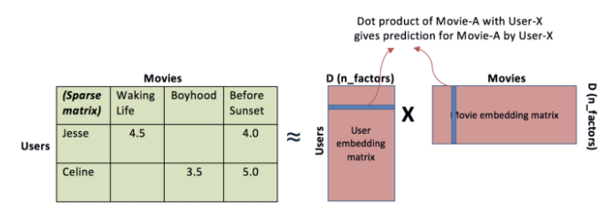 아래의 그림은 Matrix factorization 에 관한 그림이다. 그림에서 보이는 것 처럼 왼쪽의 카키색 행렬이 행렬분해로 인해 오른쪽의 분홍색 두 행렬의 행렬 곱으로 표현이 되도록 하며, 두 행렬 각각은 기존의 행렬의 행과 열에 대한 latent factor 를 가리키게 된다. 이렇게 분해된 두 행렬을 살펴보면, 먼저 두 행렬 중 왼쪽 행렬의 경우에는 Users 간의 유사도를 계산해볼 수도 있고, 오른쪽 행렬의 경우는 Movies 간의 유사도를 계산할 수도 있다. 각 행렬이 담고 있는 행 또는 열의 정보가 무엇인지 feature 를 정의할 수는 없지만, 이렇게 수학적인 행렬분해로 성질을 표현해낼 수 있다고 보면 된다.