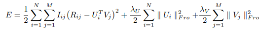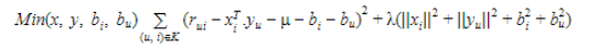 그리하여 기존의 평점인 $r_{ui}$ 와 $x, y$의 점곱으로 이루어진 $\hat{r}_{ui}$ 간의 차이의 제곱합이 곧 목적함수가 되고, 이를 최소화하는 방법으로 진행이 된다.