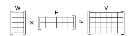 SVD 와 더불어 행렬을 분해하여 원래 행렬과 최대한 유사하게 나타낼 수 있도록 하는 방법이 NMF 이다. 이 NMF 는 SVD 의 방법과도 그 맥락이 비슷하다고 할 수 있다. NMF 의 목표는 아래의 그림처럼 W와 H 의 dor product로 V를 approximate 하는 것이라고 할 수 있다. W x H 행렬의 차원은 V 행렬을 따라가거나 우리가 정한 차원으로 생성이 가능하다. 또한 특징으로는 W, H의 원소들과 V 의 원소들 모두 0 보다 큰 non-negative 한 값을 가진다. 왜냐하면 음수가 들어가면 방향까지 고려해야 하는데 이 알고리즘에는 벡터의 방향까지 고려하게끔 설계되지 않아 이에 해당되지 않는다고 생각한다.
