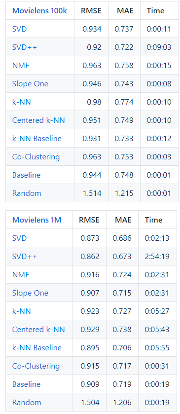 아래의 표는 추천시스템 성능 연구에서 대표적인 데이터셋으로 사용되는 Movielens 100k, 1M 데이터을 가지고 다양한 추천시스템 알고리즘으로 성능을 비교해본 결과이다. 아래에 보면 SVD, MMF 와 같은 model based CF 방법이 K-NN 과 같은 memory based CF 알고리즘보다 성능이 나은 것을 확인할 수 있다.