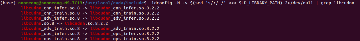 ldconfig -N -v $(sed 's/:/ /' <<< $LD_LIBRARY_PATH) 2>/dev/null | grep libcudnn