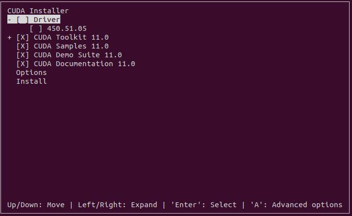 두번째 명령어 sudo sh cuda_11.0.2_450.51.05_linux.run 를 입력하고 기다리다보면, 입력창이 나온다.