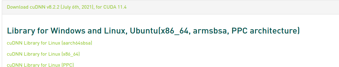 https://developer.nvidia.com/rdp/cudnn-archive 사이트에 방문해 아래의 CUDA버전 11.4의 cuDNN Library for Linux [x86_64]를 클릭해 압축파일을 다운받았다.