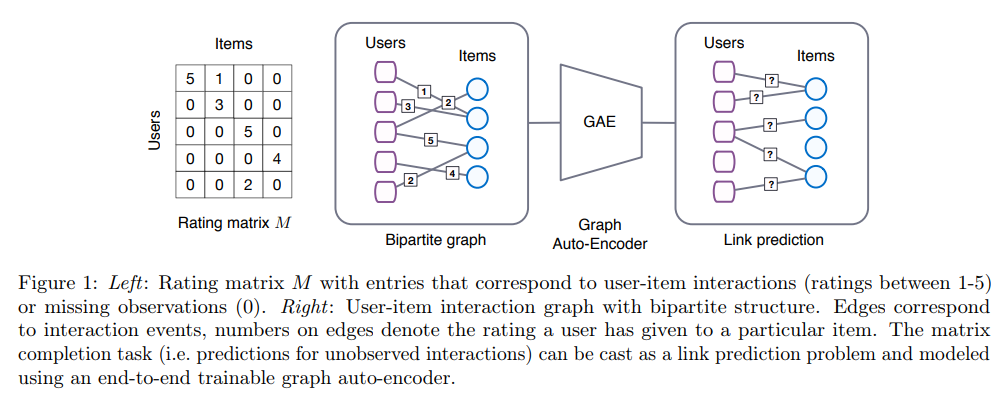 본 논문에서는 행렬 완성(completion)을 그래프의 링크를 예측하는 문제로 봅니다. CF는 사용자와 아이템 간의 이분 그래프로 나타낼 수 있기 때문입니다. 그래서 사용자가 평가한 아이템을 예측하는 문제는 곧 사용자에서 아이템으로 뻗는 링크를 예측하는 것으로 볼 수 있습니다.
