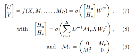 먼저 Graph Encoder는 $Z = f(X,A)$와 같이 정의합니다. 함수 $f$에 입력으로 들어가는 $X$는 사용자x아이템 크기의 행렬로 그래프기반 행렬을 구성할 때 늘 등장하는 형태의 행렬이네요. $A$는 인접행렬로 서로 어떻게 연결이 되어 있는지 연결 정보를 말해주는 행렬입니다. 이를 위해 $Z=f(X, M_{1}, ... , M_{R})$와 같이 각 평점마다 행렬을 구성해서 해당 평점을 가진 쌍에게 0 또는 1로만 체크해서 평점 정보를 갖도록 합니다. 이 과정을 거침으로써 사용자와 아이템의 latent feature를 생성하게 됩니다.
