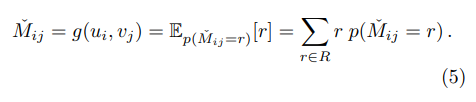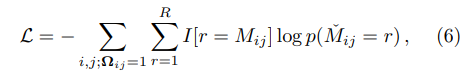 loss: negative log likelihood를 최소화하는 방향으로 학습을 진행하네요. $k=l$인 경우에는 $I[k=l] = 1$이 되고 그렇지 않은 경우에는 0을 줍니다. 이는 관측되지 않은 값에 대해서 mask를 씌운다고 보면 됩니다. 예측평점과 실제평점을 고려할 때 실제 평점이 없으면 loss를 구할 수 없기 때문입니다.