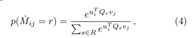 디코더 부분에서 예측평점을 출력한다고 했는데, 보통 사용자와 아이템 벡터의 내적으로 예측평점을 뽑아냈다면 여기서는 아래와 같이 softmax 함수로 뽑아내게 됩니다. $Q_{r}$은 $E \times E$ 차원의 학습가능한 파라미터 행렬입니다.