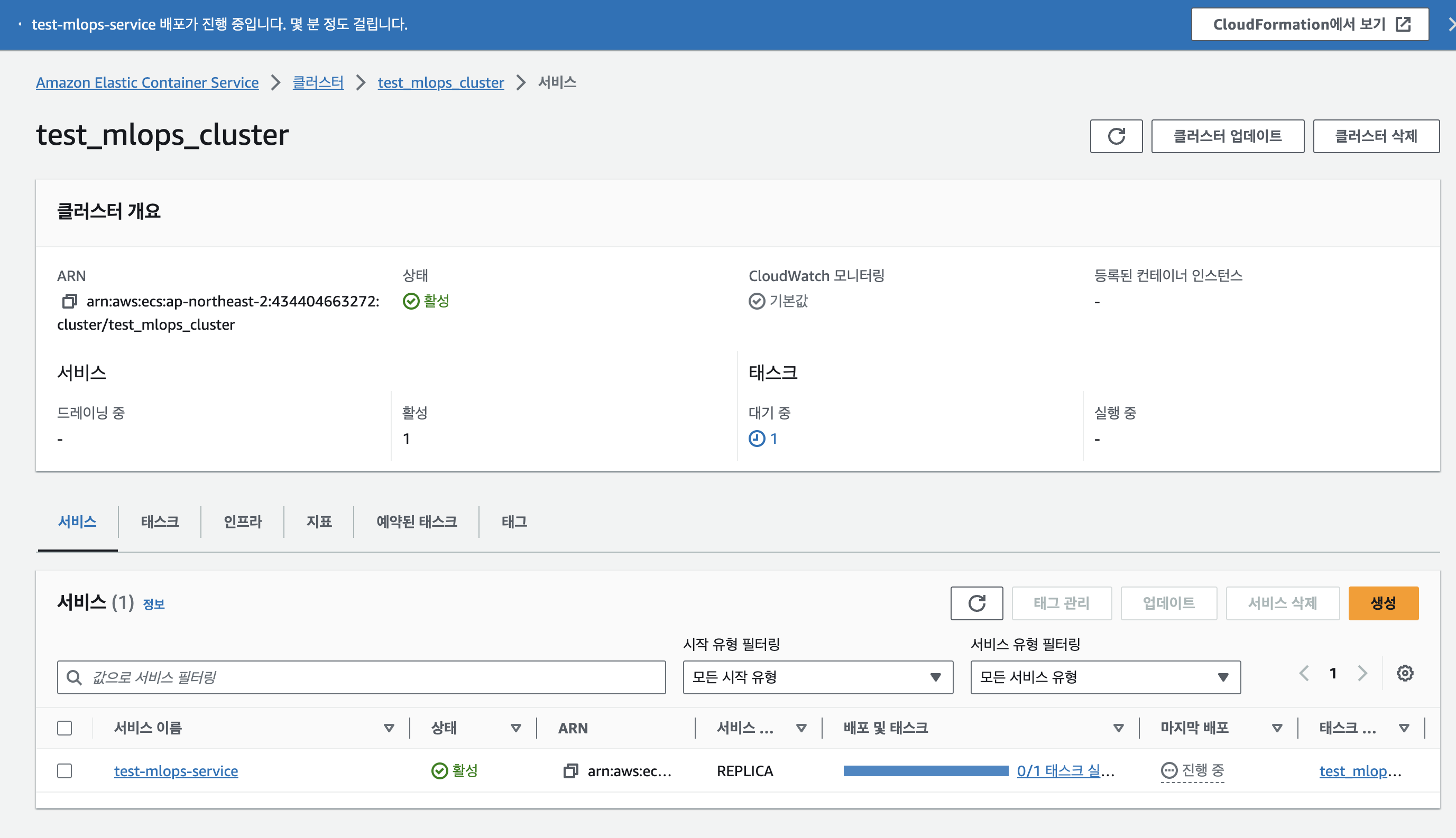 여기서 배포가 잘 이뤄진다면 url에 포트 5000로 붙으면 hello world! 가 떠야할텐데, 쉽게 서비스가 생성이 안된다.. 그래서 지금 IAM 사용자의 EC2, ECS 권한을 모두 full로 부여하고 다시 해보려 한다.