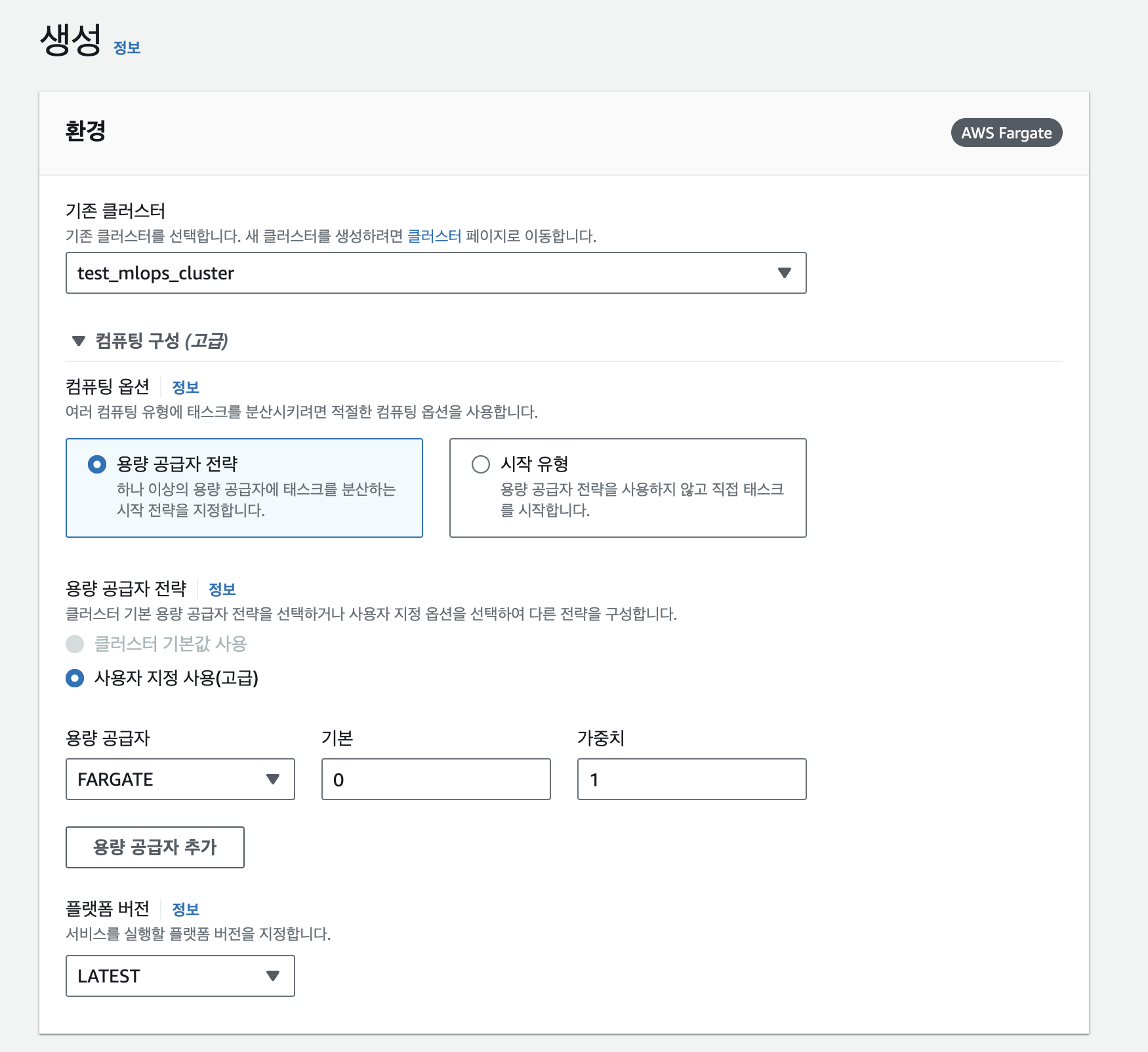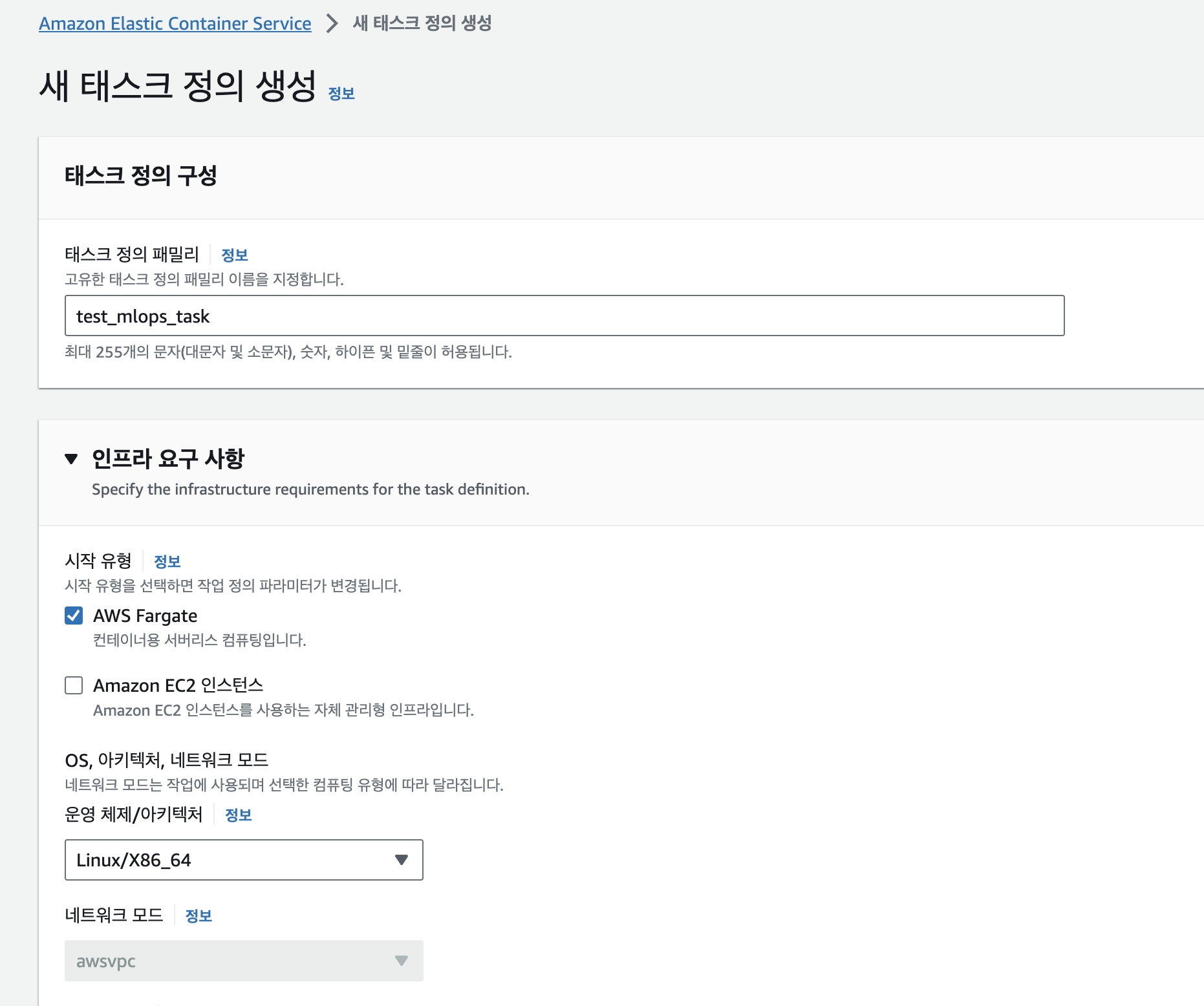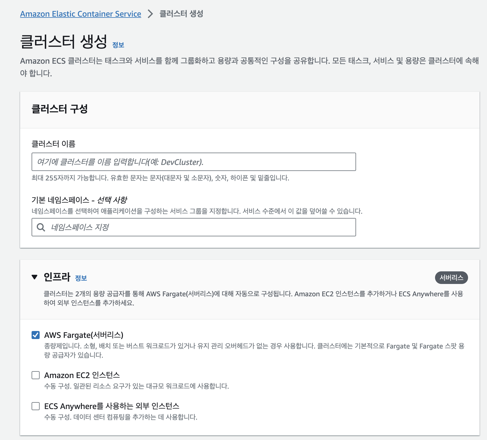 >> EC2는 인스턴스 자체로 우선 돈을 내야해서 덜 유연하지만 아직 작업이 복잡하지 않은 관계로 Fargate로 생성했다.