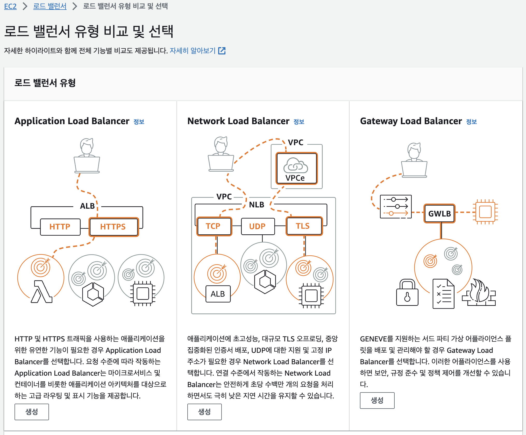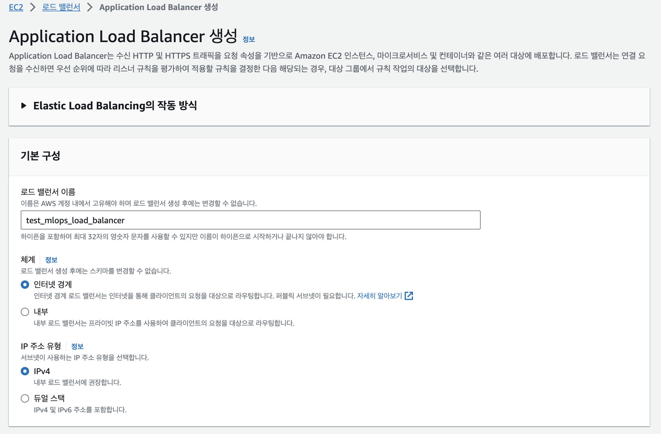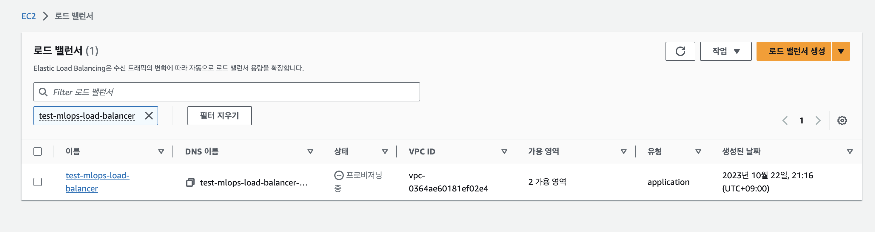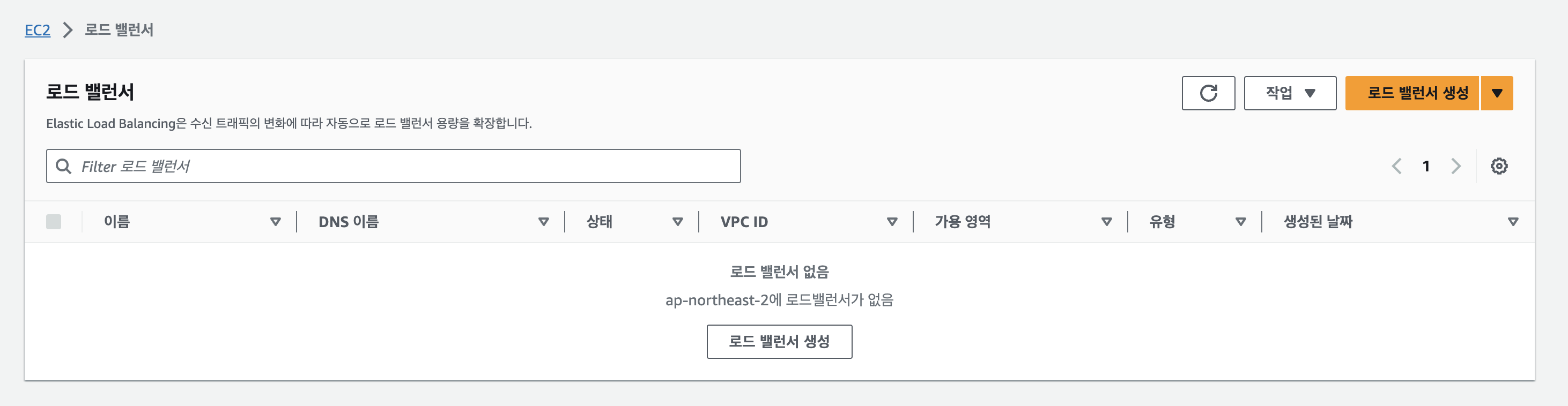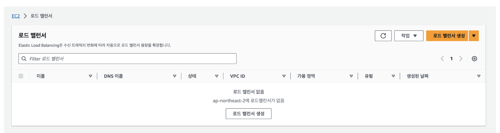 >> EC2로 넘어가서 로드 밸러서를 생성한다. 로드밸러서는 트래픽을 분산처리할 수 있게 해주는건데, 지금 그렇게 필요하진 않지만 공부니까 생성한다.