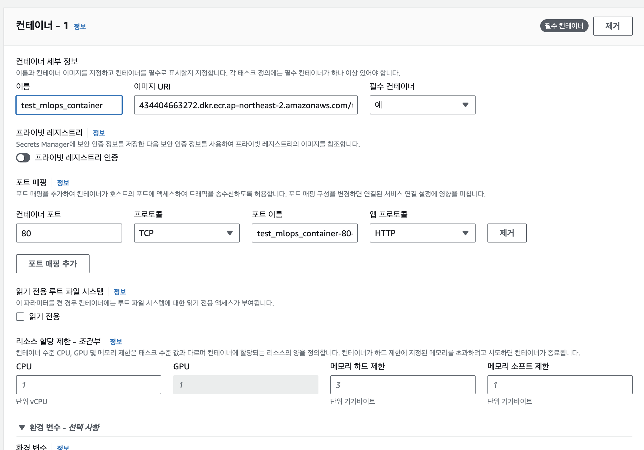 >> 이름을 지어주고, ECR에 저장했던 이미지 URI를 가져와서 넣어준다. 포트는 도커파일에서 80포트를 지정했는데 디폴트에 있어 그대로 둔다.