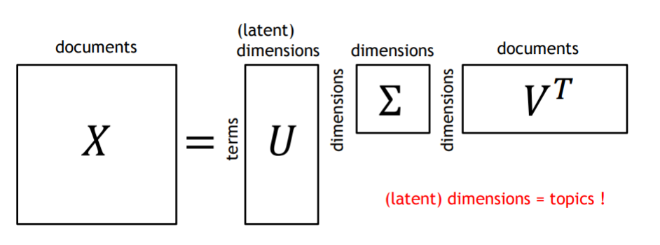 LSA: Latent Sementic Analysis의 약자로 잠재 의미 분석이라는 뜻이다. 아래의 그림처럼 $X$라는 단어 문서 행렬을 SVD(특잇값분해)를 통해서 3개의 매트릭스 곱으로 나타내고, 차원수도 줄이게 되고 이러한 과정 중에 잠재된 의미를 찾는다는 것이다.