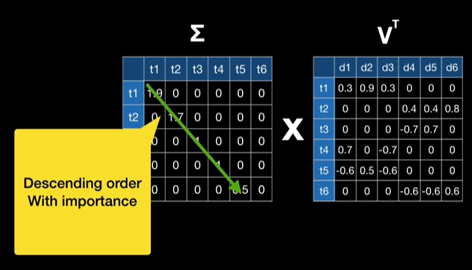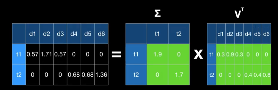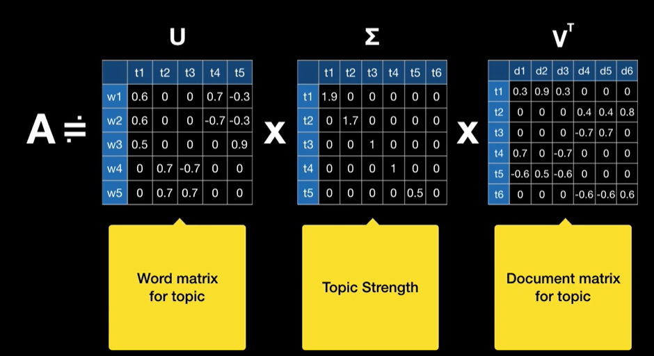 A매트릭스를 특잇값분해하면 단어가 행으로 들어왔기 때문에 $U$매트릭스는 토픽을 위한 단어 매트릭스라고 말할 수 있고, $V^{T}$ 매트릭스는 문장 매트릭스가 된다. 가운데 $\sum$매트릭스는 토픽의 강도(가중치)가 된다.