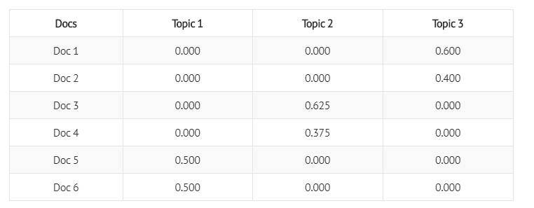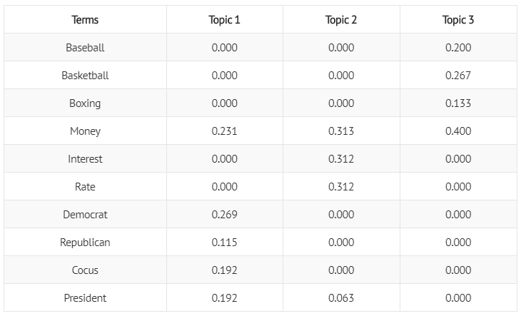 다음으로 $P(d|z)$의 결과를 봅니다. 이를 통해서 문서별로 각 토픽에 대한 확률 값을 갖게 되는데, 여기서 해석은 사용자가 해주어야하는데 문서 1이나 2같은 경우는 토픽 3이고, 가진 단어들로 볼 때 스포츠에 관련된 토픽이라고 유추해볼 수 있습니다.