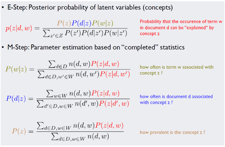 M스텝에서는 통계에 기반한 모수 추정입니다. $P(w|z)$, $P(d|z)$, $P(z)$ 확률들은 각각 위의 설명처럼 "얼마나 단어 $w$가 토픽 $z$와 연관되어 있느냐?", "얼마나 문서 $d$가 토픽$z$와 연관되어 있느냐?", "얼마나 토픽 $z$가 빈번하게 쓰이느냐?" 에 관한 확률값들을 나타내는 것이다.