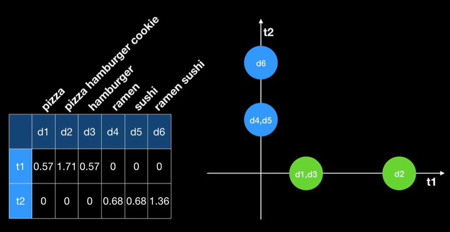 파란점들과 녹색 점들 사이에는 각이 90도라 코사인 유사도가 0 이 된다. 파란점들끼리 혹은 녹색점들끼리의 유사도는 벡터값의 크기는 다르지만 방향이 동일하기 때문에 유사도는 1로 가장 높게 나온다.