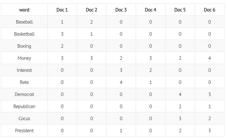 아래의 그림은 수식으로만 보았던 문서와 단어 행렬이다.