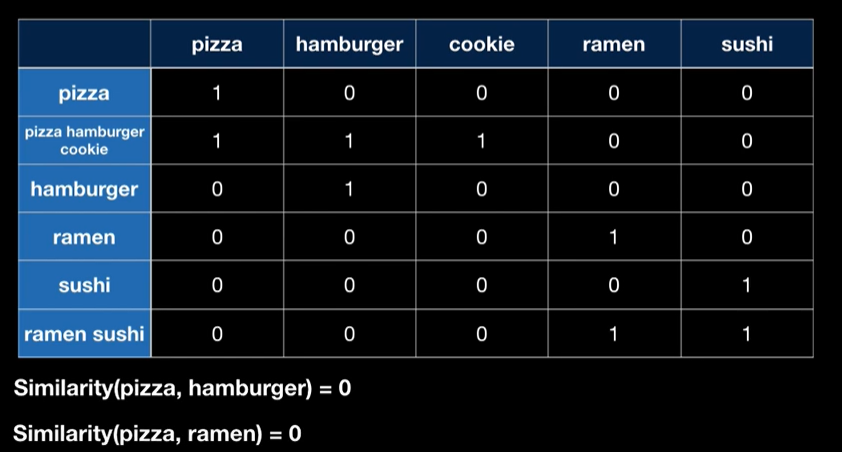 우선 위의 그림처럼 메뉴가 있고, 구성으로 미국음식 3개와 일본음식 2개가 있다고 치자. 이를 BOW방식으로 유사도를 구하게 되면, 아래의 그림처럼 메뉴-음식 행렬로 만들어 볼 수 있다.