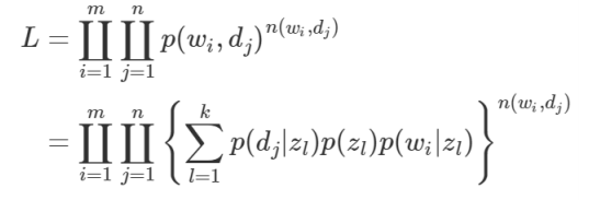 아래의 그림처럼 $m$개의 단어, $n$개의 문서, $k$개의 주제(토픽)에 대해서 아래 우도함수(likelihood function)를 최대화하는 것을 목표로 한다.