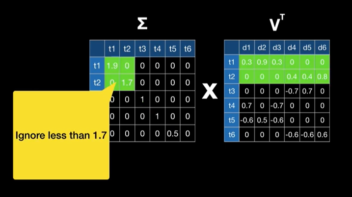 위 그림을 토대로 얘기하면 우리가 알고자 하는 것은 문장 벡터(Document matrix for topic)이기 때문에 아래의 그림처럼 두 행렬의 곱을 이용한다. $\sum$ 벡터행렬과 $V^{T}$ 벡터행렬의 곱으로 피자와 햄버거의 유사도를 알 수 있다.