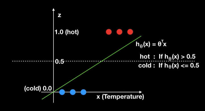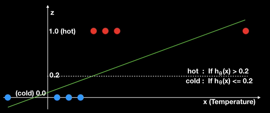 아래의 그림은 입력벡터가 2개 추가 되었다. 입력벡터가 조금 달라져서 회귀 직선이 달라진 것을 볼 수 있다. $\hat{y}$ 추정치가 0과 1사이로 나와야 하는데, 추정치가 음수 무한대, 양수 무한대 범위가 되어 버려서 회귀직선(초록색선)을 기준으로 경계값이 자꾸 변하게 되서, 아래와 같은경우는 추정치가 0.2만 넘어도 hot으로 분류를 해버리는 뭔가 정의롭지 못한 상황이 발생한다. 어쨌든 중요한건 0~1사이의 확률값으로 좀 나와줘야하는데, 0보다 작은(현재파란색제일왼쪽)값이나 1보다 큰(현재빨간색제일오른쪽)값이 등장해서 문제가 발생한다는 것이다.