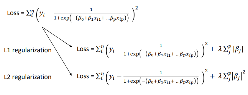 -Logistic Regression 모델의 경우, 다음과 같이 cost function에 가중치의 절댓값 혹은 절댓값의 제곱을 더해주면서 일반화를 진행한다.