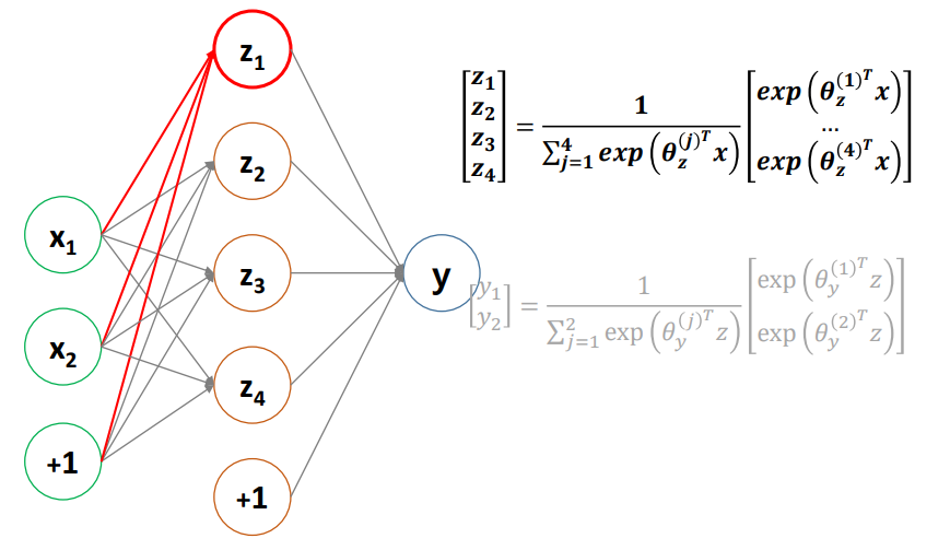 위 식을 입력벡터 $x$가 주어졌을 때, 범주가 1일 확률을 기준으로 정리하면 다음과 같다.