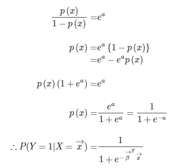 ($x$가 주어졌을 때 범주1일 확률을 $p(x)$ 이라 하고, 위의 로그승산이있는 식에서 우변을 $a$로 치환하여 정리하였다.)