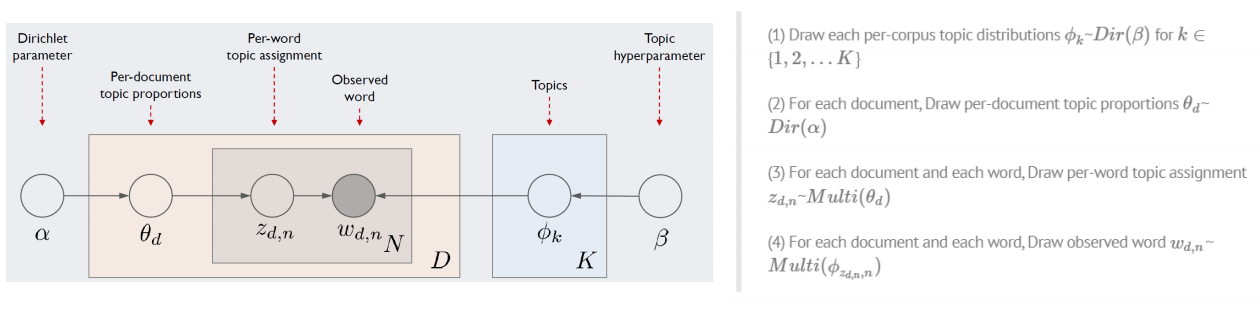 아래의 그림은 LDA의 모델 아키텍처이다. 여기서 D는 전체 문서의 개수, N은 문서 d에 포함된 단어의 개수, K는 전체 토픽 수 (하이퍼 파라미터) 이고, 이 네모안에서 각기 수만큼 반복하라는 의미이고, 동그라미는 변수를 나타낸다.