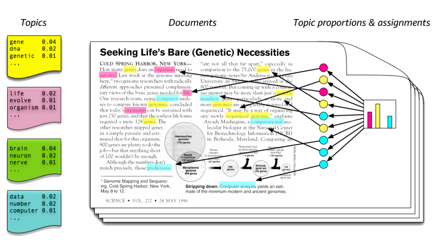 아래의 그림은 논문인가, 게재된 LDA를 설명할 때 자주 쓰이는 그림인데, 이 그림을 통해서 LDA가 보여주려 하는 것을 파악해 볼 수 있다. 우선 가장 오른쪽에서 보여지는 그래프로 토픽들은 문서에 토픽들이 색깔별로 저렇게 분포한다고 말해주고 있고, 그다음 가장 왼쪽에 토픽 내에 단어들의 분포를 나타내주게 됩니다.