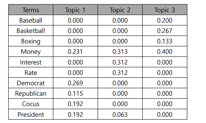 -$\theta_{d}$는 $d$번째 문서가 가진 토픽 비중을 나타내는 벡터 $\phi_{1}$은 아래표에서 첫번째 열.