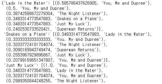 각 항목들이 공통으로 가진 사람에 대한 평점을 기준으로 거리를 구하고 이를 이용하여 점수까지 구하고, 순차적으로 나타낸 것이다. 이를 통해서 우리는 항목별로 유사한 것들이 무엇인지 정량적으로 알아볼 수 있게 되었다.