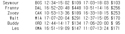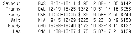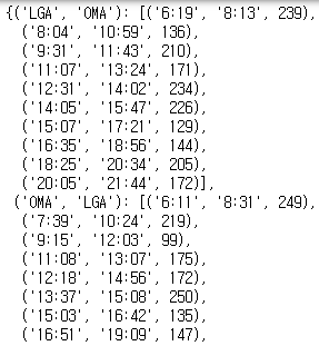 이 데이터를 origin과 dest를 키로 하고, 상세 비행편 정보 리스트를 값으로 하여 딕셔너리에 로드하자.