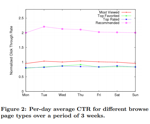 -> 추천 기능은 1년 이상 유투브 홈페이지의 일부였으며 명시된 목표의 맥락에서 매우 성공적이었다. 예를 들어 추천은 홈페이지에서 모든 영상 클릭의 약 60%를 차지한다. 추천의 성능을 홈페이지의 다른 모듈과 비교하면 추천 영상제시의 편향(추천은 기본적으로 최상위에 위치한다.)이 발생한다. 이를 위해 'browse'페이지에서 CTR 행렬을 보고 다른 알고리즘으로 생성된 영상 셋과 추천을 비교한다. a) 하루 중 가장 많은 수의 조회수를 받은 가장 많은 시청률-영상, b) 시청자가 즐겨 찾기 모음에 추가한 Top Favorited-영상 및 c) 하루 중 가장 유사한 등급을 받은 최고 등급-영상.