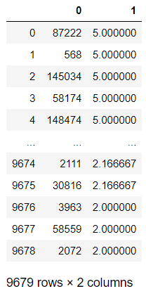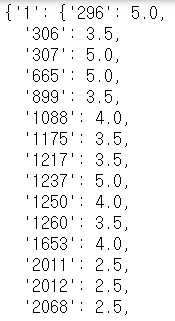 <- 이런형태로 사용자 x 아이템 평가 데이터를 만들어 주는 것이다. 데이터 프레임을 사용할 경우 엄청나게 많은 sparse들을 피하고 계산 성능을 올려주기 위해 딕셔너리를 사용한다.