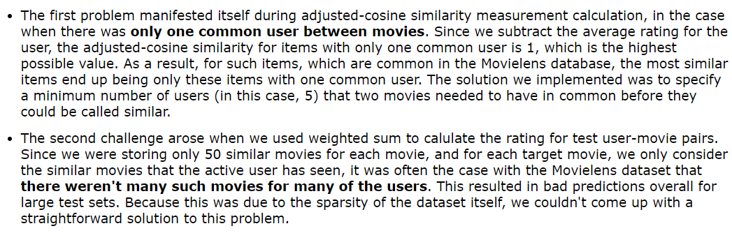 2. 나와 유사도가 1인 이웃이 있다. 그 이웃은 나와 공통으로 항목에 평점을 매긴 수는 오직 1개이다. 내가 누군가와 특정 한가지 아이템에 대해서 완전히 동일한 평점을 줄 가능성은 현실세계에서 농후하다고 생각이 든다. 그렇기 때문에 더 많은 데이터를 모아 극단적인 예들의 영향력을 줄여준다. 하지만 계산량에도 한계가 있을 것이므로, 제한된 범위 내에서 유사도를 잘 측정하는 방법에 대해서 더 공부해야겠다.